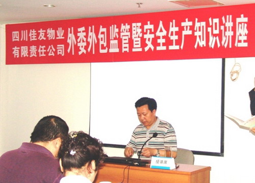 為全面貫徹川投集團安委會2011年第二次例會精神,堅持“安全第一,預防為主,綜合治理”的方針,提高員工安全生產(chǎn)意識,落實佳友公司董事長李文志在第二屆八次董事會上提出的“監(jiān)管到位,責任履行到位,安全才有保障”的安全生產(chǎn)工作要求,營造人人講安全、處處有安全、事事保安全的濃厚氛圍,提高佳友公司各級安全生產(chǎn)管理人員的履職能力,做到知法懂法、依法管理,在以“安全責任,重在落實”為主題的2011年“全國安全生產(chǎn)月”活動開始之際,佳友公司高度重視安全生產(chǎn),精心策劃,特邀到國內(nèi)知名安全生產(chǎn)法規(guī)專家、四川省安全生產(chǎn)監(jiān)察執(zhí)法總隊總隊長周彤,于2011年6月1日蒞臨川投大廈宣講“外委外包監(jiān)管暨安全生產(chǎn)知識”,對佳友公司所屬八個項目的負責人、部門副主管(或領(lǐng)班)以上44名管理人員作了安全生產(chǎn)知識專題培訓。
