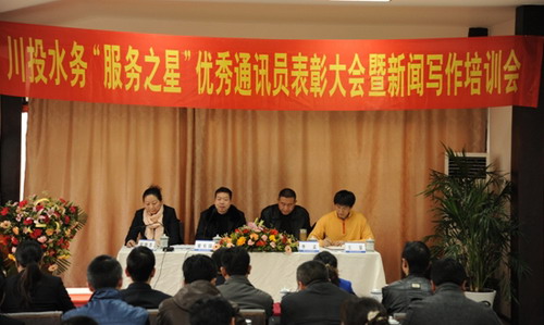 3月15日下午,川投水務(wù)2011年度“服務(wù)之星”、優(yōu)秀通訊員表彰大會(huì)暨新聞寫作培訓(xùn)會(huì)在邛崍平樂古鎮(zhèn)濯纓水閣酒店舉行,川投水務(wù)總經(jīng)理梁有國(guó)出席會(huì)議,綜合部經(jīng)理何曉蘇主持會(huì)議,來自川投水務(wù)所屬公司部分班子成員、綜合部經(jīng)理、“服務(wù)之星”、通訊員代表,以及川投水務(wù)本部通訊員和相關(guān)人員共四十余人參加了會(huì)議。
