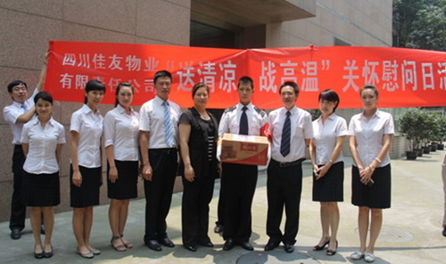 7月中旬,已進入三伏天氣,夏日炎炎,各地氣溫居高不下。在成都最高氣溫已經(jīng)達到32℃的炎熱環(huán)境下,佳友物業(yè)的員工們?nèi)匀幻爸崾顖允卦谧约旱膷徫簧?。為了表達公司對員工的關(guān)懷之情,2012年7月13日中午,公司董事長穆婷云親自帶隊,總經(jīng)理王賓、總經(jīng)理助理史健陪同,來到川投物業(yè)服務(wù)中心各一線崗位,為員工們送去夏日的一絲清涼、一絲關(guān)懷。