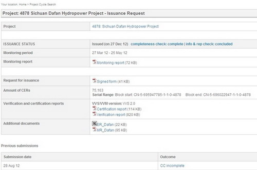 據(jù)聯(lián)合國氣候變化框架公約網(wǎng)站公布的消息,田灣河公司仁宗海、金窩、大發(fā)水電站CDM項(xiàng)目從注冊(cè)日起至2012年5月25日的首次減排量已于2012年12月全部通過核證,成功簽發(fā)。首次簽發(fā)的減排量依次為37.7886萬噸CO2e、60.2744萬噸CO2e,7.5163萬噸CO2e,共計(jì)105.5793萬噸CO2e。