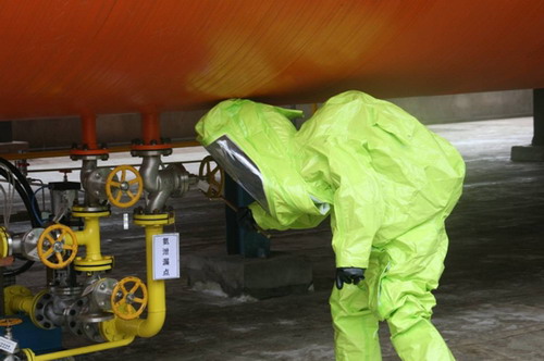 川南發(fā)電公司脫硝技改項目采用液氨作為脫硝反應(yīng)劑,液氨屬重大危險源,一旦發(fā)生泄漏,將可能引發(fā)中毒、爆炸等不安全事件,為此公司高度重視,不斷加強安全預(yù)防、教育培訓(xùn)相關(guān)工作。為檢驗和提高員工對液氨泄漏事故的應(yīng)急處置能力,進一步增強員工安全意識,公司專門組織了此次事故演練。14:30,演練正式開始。事故假設(shè)兩名化學(xué)運行人員在巡視檢查時發(fā)現(xiàn)#1液氨儲罐出口管路一次手動門后法蘭泄露,泄露液氨化為氣態(tài)氨并迅速擴散,現(xiàn)場空氣中氨濃度超標,員工A中毒昏倒。員工B迅速佩戴防護面具,把中毒人員往上風口運送,并向值長匯報。14:38,應(yīng)急人員相繼到達現(xiàn)場,嚴格按照應(yīng)急演練方案進行處置工作。14:42分,一名設(shè)備部人員身著防護服、佩戴正壓式空氣呼吸器,在運行人員的配合下,成功隔離漏泄點,應(yīng)急演練結(jié)束。