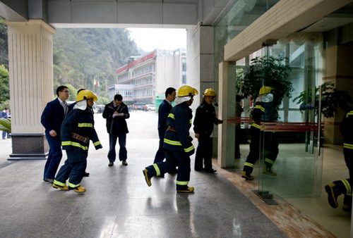 11月19日15時40分,田灣河公司電站現場營地接待中心物業(yè)值班員向營地保衛(wèi)值班室報火警:接待中心三樓電纜線井發(fā)生火災,有大量毒煙,火勢未得到控制,并有增大跡象,目前正在組織疏散撤離,暫無人員受傷,請快速組織人員增援救火。同時,值班人員大聲呼喊:著火啦?。?!所有人員快速撤離接待中心大樓!??!