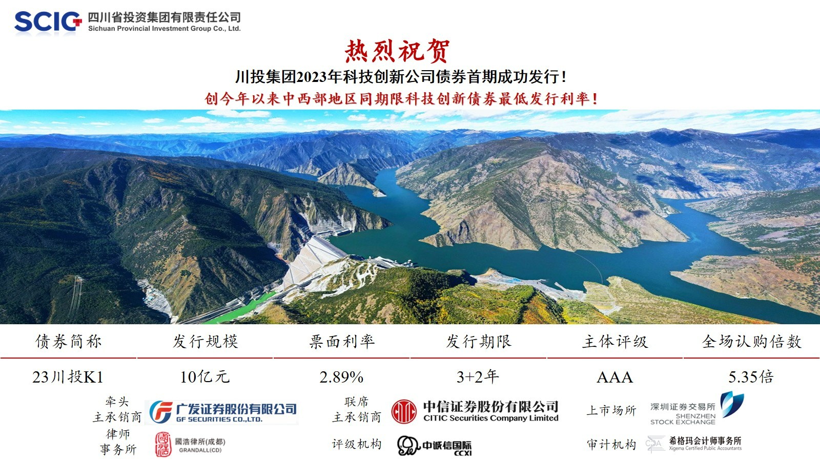 7月6日,四川省投資集團有限責任公司2023年面向?qū)I(yè)投資者公開發(fā)行科技創(chuàng)新公司債券(第一期)在深圳證券交易所成功發(fā)行。本期公司債券發(fā)行規(guī)模10億元,債券期限3 2年,發(fā)行票面利率2.89%,低于央行五年期LPR定價131個BP,創(chuàng)2023年以來西部地區(qū)同期限公司信用類債券最低發(fā)行利率,中西部地區(qū)同期限科創(chuàng)債最低發(fā)行利率,同時創(chuàng)川投集團成立以來中長期債券發(fā)行利率最低歷史記錄。