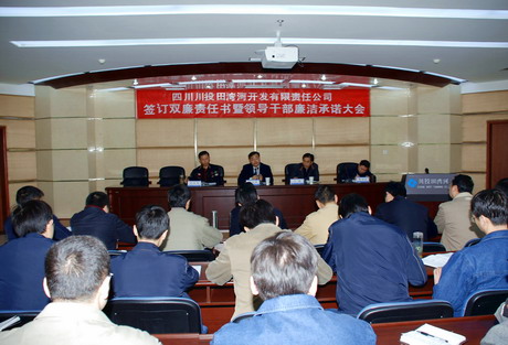 會(huì)上,孫志祥代表經(jīng)營(yíng)班子成員向全體員工進(jìn)行了廉潔承諾,同時(shí)代表公司與各部門(mén)負(fù)責(zé)人簽訂了《廉潔經(jīng)營(yíng)、廉政建設(shè)責(zé)任書(shū)》。公司副總工程師、大發(fā)項(xiàng)目管理部經(jīng)理何廷剛代表公司部門(mén)負(fù)責(zé)人向全體員工進(jìn)行了廉潔承諾。經(jīng)營(yíng)班子成員和各部門(mén)負(fù)責(zé)人都鄭重地在廉潔承諾書(shū)上簽了字。