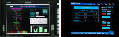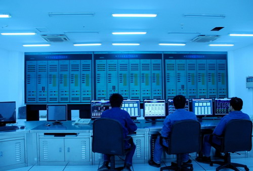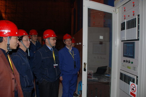 公司黨委書記、總經(jīng)理孫志祥(左四)、副總經(jīng)理王新(左一)、盧建奎(左二)在監(jiān)控屏前觀察機(jī)組狀態(tài)。