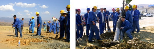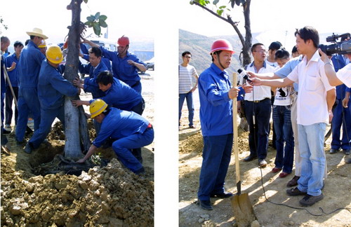 會(huì)后,公司領(lǐng)導(dǎo)與100余名職工在烈日下?lián)]鎬使鏟,在黃磷爐渣露天堆場(chǎng)種下橡皮樹(shù)、高山榕60余株。
