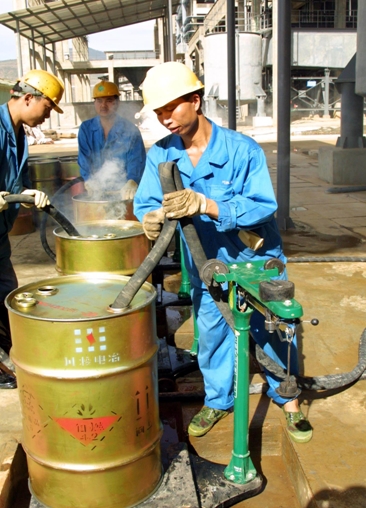 圖四:災情發(fā)生后,川投化工號召全體職工“立足本職,加倍努力,以實際行動支援災區(qū)”(圖為生產一線職工灌裝成品黃磷時情景)。
