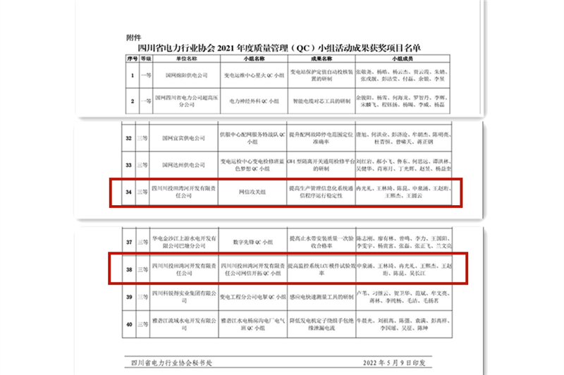 5月11日,四川省電力行業(yè)協(xié)會組織開展的省電力行業(yè)2021年度質(zhì)量管理(QC)小組活動成果評審結(jié)果揭曉,田灣河公司《提高生產(chǎn)管理信息化系統(tǒng)通信程序運行穩(wěn)定性》《提高監(jiān)控系統(tǒng)LCU模件試驗效率》兩項QC活動成果榮獲三等獎。