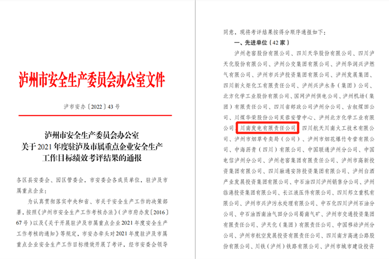近日,在瀘州市安全生產(chǎn)工作目標績效考評中,川南發(fā)電公司又一次榮獲“瀘州市2021年度安全生產(chǎn)工作目標績效考評先進單位”表彰。此前,公司已連續(xù)多年獲此榮譽。