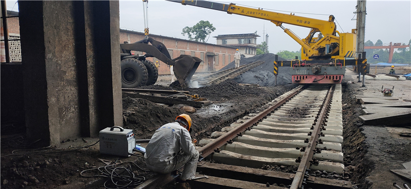 該道口是火車進(jìn)出節(jié)材二廠原料上料庫與運(yùn)貨汽車進(jìn)出龍門吊下方3號料場的必經(jīng)路口,近期因料場收儲量增大,重型貨車通行頻繁,造成鐵路路基下沉、承軌枕木損壞,鐵軌受沖擊變形、軌距超限,軌面受輾壓磨損超標(biāo)。為及時消除車輛通行安全隱患,確保節(jié)材二廠生產(chǎn)原料供應(yīng)及公司物資運(yùn)輸秩序正常,5月上旬,儲運(yùn)公司按標(biāo)準(zhǔn)規(guī)格預(yù)先編制好了新軌排,于5月16日至18日開始斷道施工。連日來,儲運(yùn)公司組織人員機(jī)械吊離了軌道板,拆除了舊鋼軌,清理平整了道床,鋪設(shè)了新鋼軌。重新填充道碴石、起道調(diào)校與搗固、堆焊平滑處理鋼軌接頭后,于5月18日晚道口具備了火車限速通行條件。