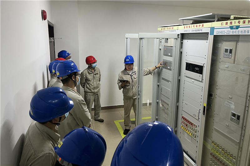 本次培訓(xùn)圍繞技改完成的金田線全新保護(hù)裝置展開,主要分為兩個階段。第一階段為理論培訓(xùn),在營地208會議室,全體成員以220kV金田線線路保護(hù)技改背景、微機(jī)保護(hù)配置及原理介紹為脈絡(luò),系統(tǒng)學(xué)習(xí)了線路保護(hù)相關(guān)理論知識;第二階段為現(xiàn)場培訓(xùn),在集控開關(guān)站繼保室、GIS室、升壓站等處,全體成員圍繞220kV金田線線路微機(jī)保護(hù)裝置與外圍聯(lián)動設(shè)備的相互關(guān)系,開展實物教學(xué),并將答疑解惑穿插于各學(xué)習(xí)環(huán)節(jié),確保有問必答。