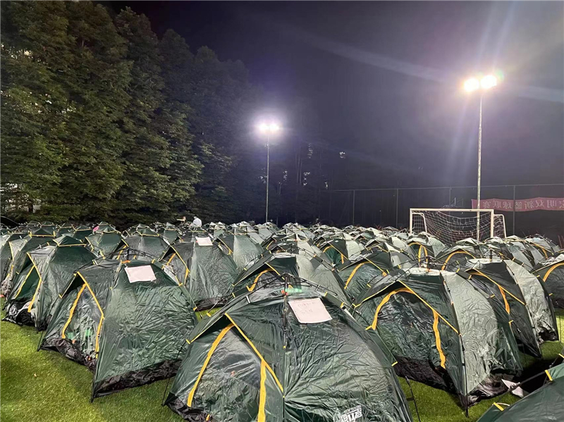 當(dāng)晚,閉環(huán)管理的職工們利用帳篷、行軍床、臨時被單、一次性洗漱用品等應(yīng)急物資,在廠區(qū)、大廳、操場、倉庫等場所搭建起了“防疫泡泡”生活安置點(diǎn)。在生產(chǎn)設(shè)備旁、工位工臺前,堅(jiān)守崗位奮戰(zhàn)一線的防疫保產(chǎn)先鋒們,就近搭建床鋪休息,并按照疫情防控要求輪班值守執(zhí)勤,確保閉環(huán)管理嚴(yán)密周全。