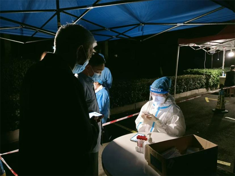 宏明電子資產(chǎn)管理中心老區(qū)管理辦公室副主任江利,正協(xié)助社區(qū)工作者和醫(yī)務(wù)人員,逐項比對社區(qū)居民信息,以盡快完成當天核酸檢測工作。