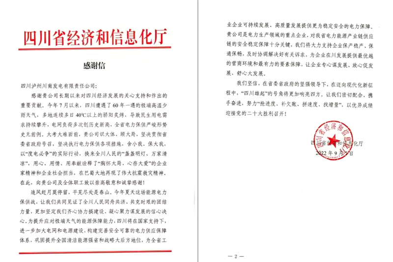 近日,四川省經(jīng)濟和信息化廳給川南發(fā)電發(fā)來一封感謝信,對川南發(fā)電在電力保供形勢異常嚴峻的2022年夏天彰顯出的社會擔當和做出的重要貢獻表示誠摯感謝。