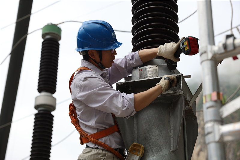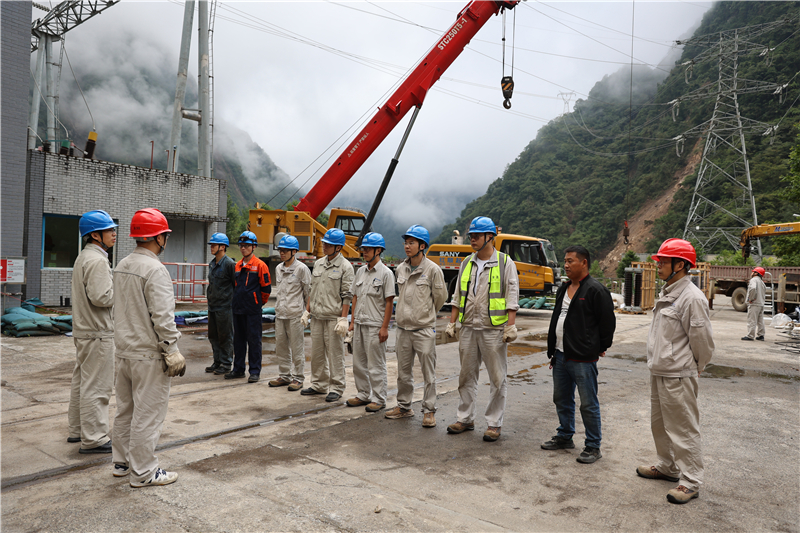 9只受損避雷器更換安裝覆蓋金仁線、金田線、仁田線,經(jīng)過周密部署和嚴格技術交底,公司集結10余名技術骨干,緊急調配25噸吊車和8噸自卸車,完成各項技術和資源保障。工作現(xiàn)場,技術人員有條不紊地將受損避雷器從28米高的升壓站吊至地面,再利用自卸車完成上下2節(jié)避雷器組裝,最后吊裝至升壓站逐個安裝調試?,F(xiàn)場人員緊密協(xié)作,安裝更換過程細致平穩(wěn),安裝質量效率得到有效保障。與此同時,大發(fā)電站壓力鋼管下平段內部檢查,大發(fā)、金窩電站機電設備全面檢查也在緊張有序地進行中。
