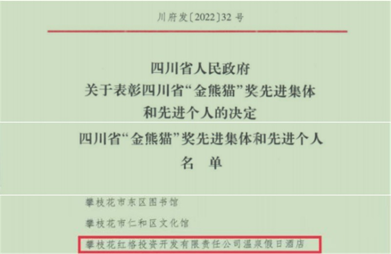 近日,四川省人民政府發(fā)布《關于表彰四川省“金熊貓”獎先進集體和先進個人的決定》,對全省100個集體和200名個人予以“金熊貓”獎表彰。川投大健康產業(yè)集團所屬攀枝花紅格投資開發(fā)有限責任公司(以下簡稱紅投公司)紅格溫泉假日酒店(以下簡稱假日酒店)上榜先進集體,抱回一只“金熊貓”。在本次獲獎名單中,飯店性質的獲獎單位僅有假日酒店與四川省人民政府金牛賓館兩家獲此殊榮。