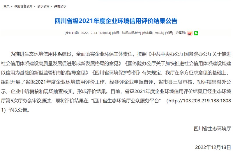按照《中共中央辦公廳 國(guó)務(wù)院辦公廳關(guān)于推進(jìn)社會(huì)信用體系建設(shè)高質(zhì)量發(fā)展 促進(jìn)形成新發(fā)展格局的意見》《國(guó)務(wù)院辦公廳關(guān)于加快推進(jìn)社會(huì)信用體系建設(shè) 構(gòu)建以信用為基礎(chǔ)的新型監(jiān)管機(jī)制的指導(dǎo)意見》《四川省環(huán)境保護(hù)條例》有關(guān)規(guī)定,四川省生態(tài)環(huán)境廳組織開展了2021年度省級(jí)環(huán)境信用評(píng)價(jià)評(píng)選工作。先后歷經(jīng)參評(píng)企業(yè)申報(bào)自評(píng),省、市、縣三級(jí)審核,初評(píng)結(jié)果對(duì)外公示,企業(yè)申訴復(fù)核和現(xiàn)場(chǎng)抽查核實(shí)等程序后,形成評(píng)價(jià)結(jié)果。目前,省級(jí)2021年度企業(yè)環(huán)境信用評(píng)價(jià)結(jié)果已經(jīng)生態(tài)環(huán)境廳第5次廳務(wù)會(huì)審議通過后正式對(duì)外公布。