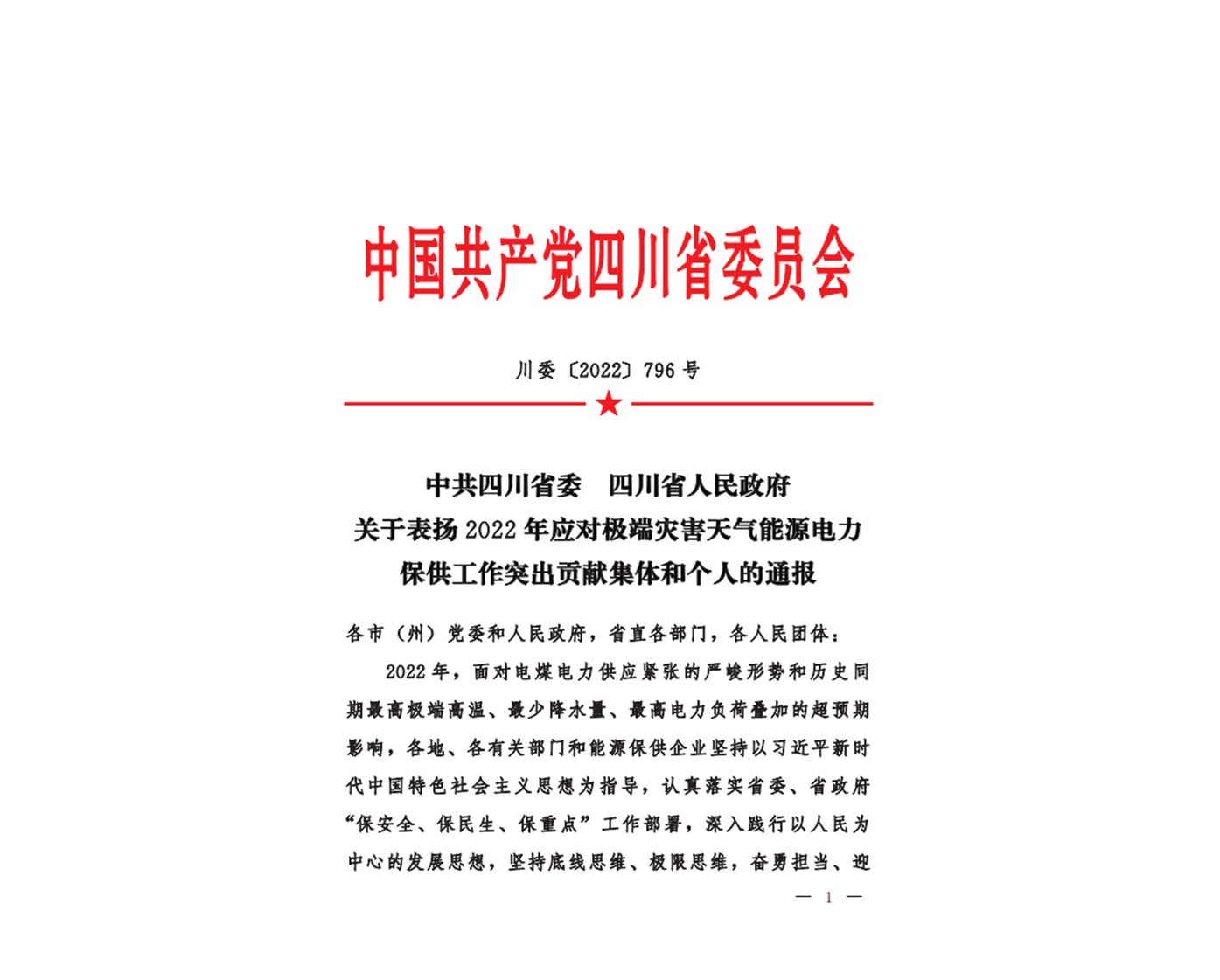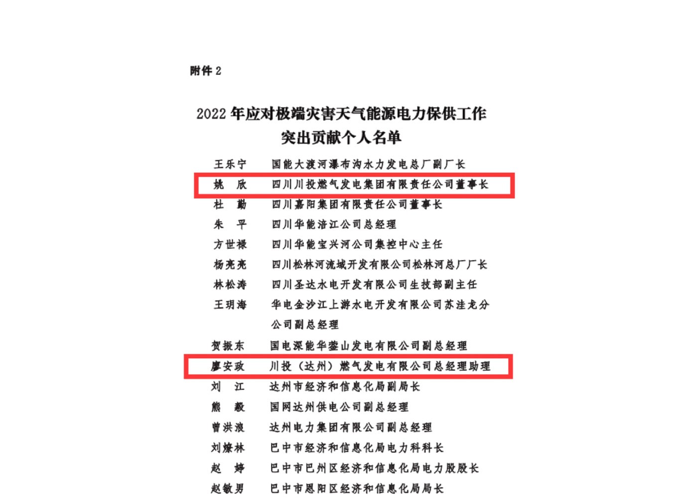 2022年12月31日,中國共產黨四川省委員會發(fā)布《關于表揚2022年應對極端災害天氣能源電力保供工作突出貢獻集體和個人的通報》(川委〔2022〕796號),川投燃電集團黨委書記、董事長姚欣、達州氣電公司總經理助理廖安政榮獲“2022年應對極端災害天氣能源電力保供工作突出貢獻”獎。這是省委、省政府對川投燃電集團能源保供工作的高度肯定。