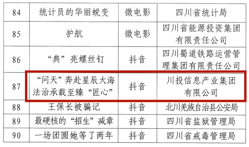 近日,第三屆川渝法治微視頻微電影大賽獲獎名單出爐,由川投信產報送的微視頻《“問天”奔赴星辰大海 法治承載至臻“匠心”》榮獲大賽三等獎。