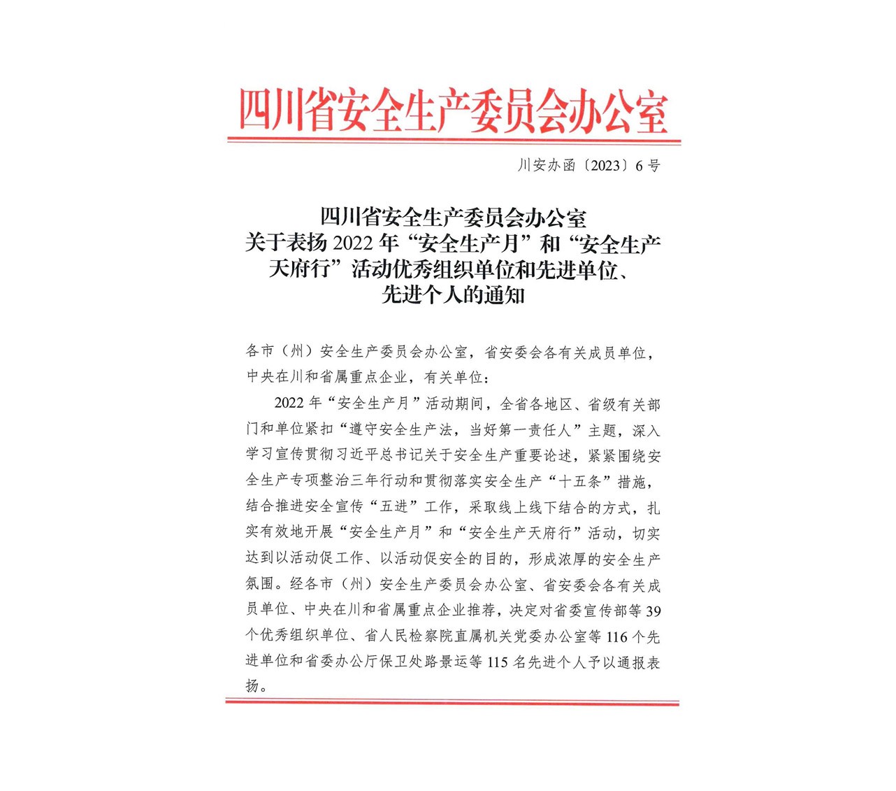 近日,四川省安全生產(chǎn)委員會(huì)辦公室發(fā)布《關(guān)于表?yè)P(yáng)2022年全省“安全生產(chǎn)月”和“安全生產(chǎn)天府行”活動(dòng)優(yōu)秀組織單位和先進(jìn)單位、先進(jìn)個(gè)人的通知》(川安辦函〔2023〕),川投信產(chǎn)所屬宏明電子獲得先進(jìn)單位稱號(hào)。