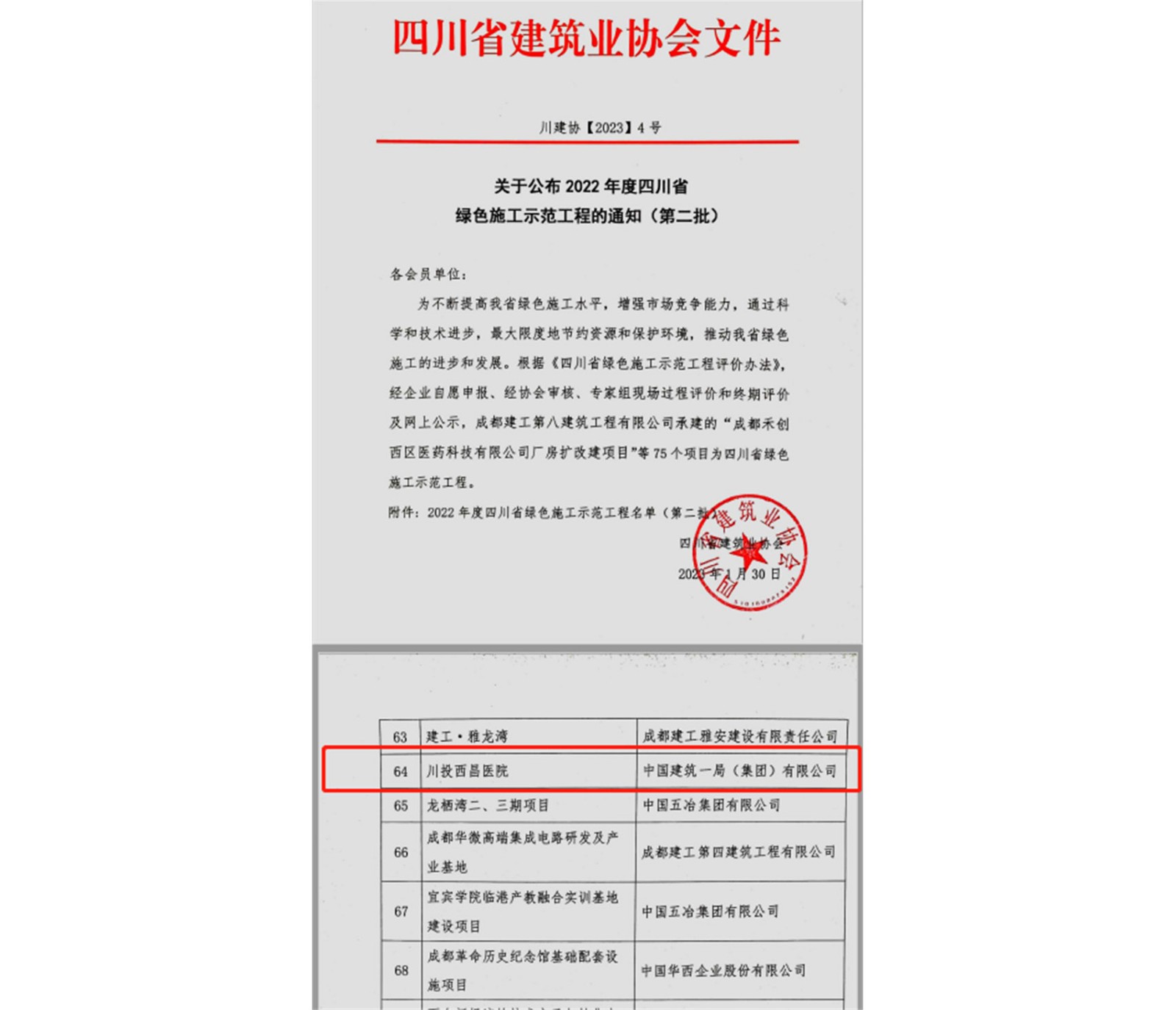 2023年1月30日,由川投集團(tuán)開發(fā)建設(shè)的川投西昌醫(yī)院被四川省建筑業(yè)協(xié)會(huì)評(píng)選為2022年“四川省綠色施工示范工程”。