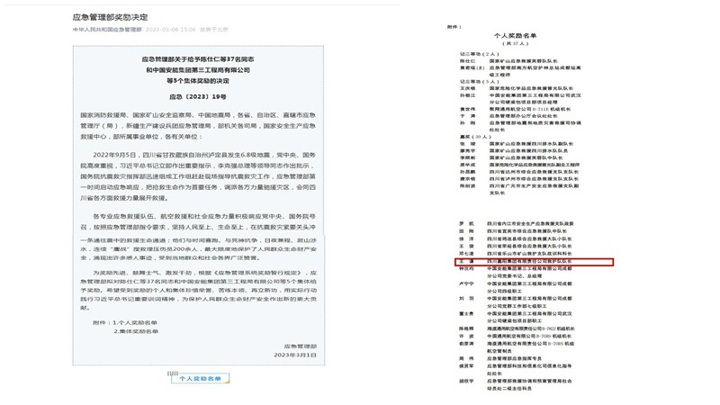 近日,中華人民共和國(guó)應(yīng)急管理部[2023]19號(hào)文件下發(fā),對(duì)瀘定抗震救災(zāi)表現(xiàn)突出的個(gè)人和集體進(jìn)行獎(jiǎng)勵(lì),嘉陽(yáng)集團(tuán)礦山救護(hù)隊(duì)隊(duì)長(zhǎng)王謙榜上有名。
