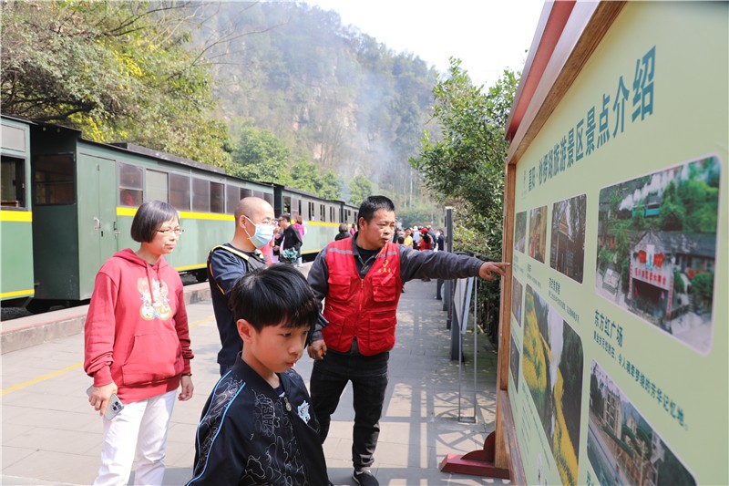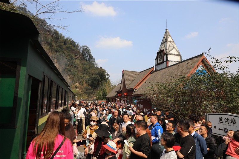 陽(yáng)春三月,菜花金黃,一列冒著蒸汽、吐著白煙的小火車(chē)帶著“嗚嗚”的汽笛聲從花叢中穿過(guò),于是山被喚醒了,花兒們競(jìng)相開(kāi)放爭(zhēng)奇斗艷,水被喚綠了,映照著藍(lán)天上的朵朵白云。這列“比熊貓還要珍貴”的蒸汽小火車(chē)吸引著四面八方的游客,于是樂(lè)山周邊縣市的攜妻帶子之旅、川內(nèi)各地的呼朋喚友之行、國(guó)內(nèi)外旅行社嘉陽(yáng)小火車(chē)賞春之程……游客們紛踏而至。游客接待中心,躍進(jìn)站、芭蕉溝火車(chē)站、黃村井觀光礦井,芭蕉溝大街小巷,到處擠滿(mǎn)了前來(lái)觀光的人群。“一票難求、一餐難求”,嘉陽(yáng)景區(qū)旅游火得發(fā)燙。