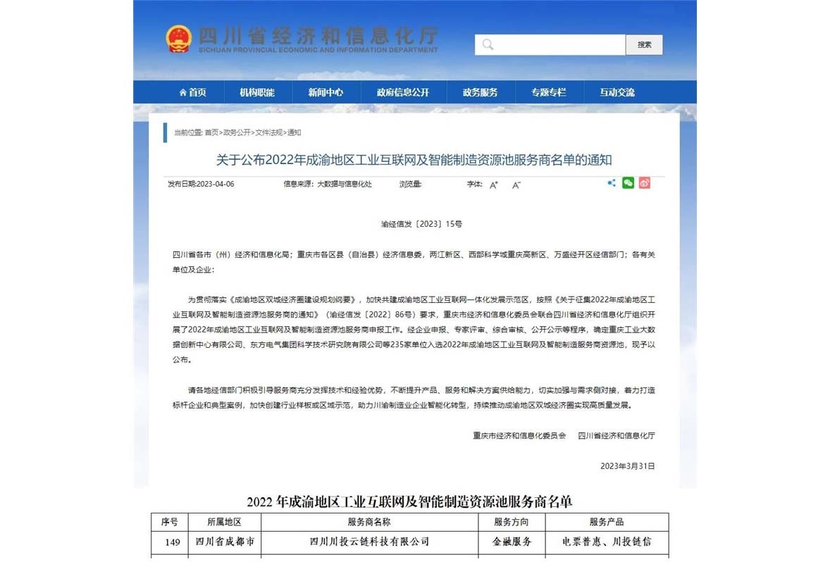 近日,四川省經(jīng)濟和信息化廳聯(lián)合重慶市經(jīng)濟和信息化委員會發(fā)布了2022年成渝地區(qū)工業(yè)互聯(lián)網(wǎng)及智能制造資源池服務商名單。川投信產(chǎn)所屬四川川投云鏈科技有限公司成功入選。