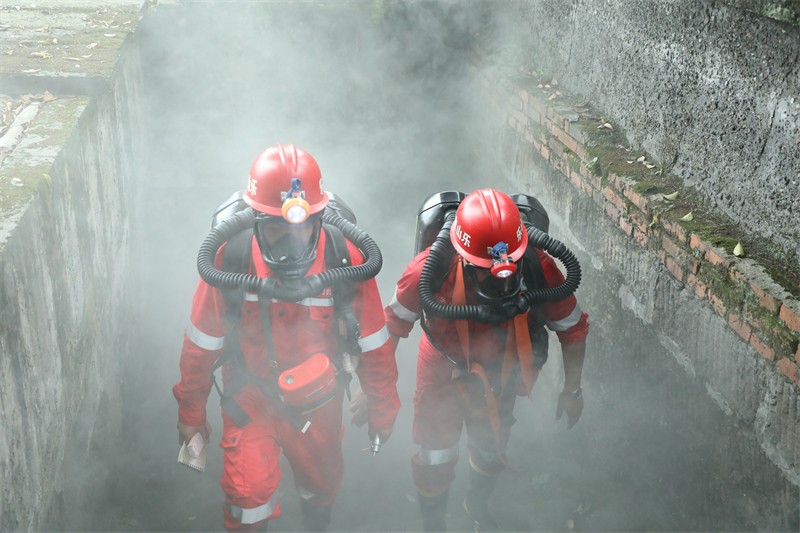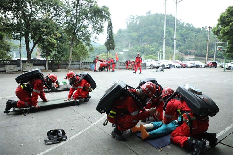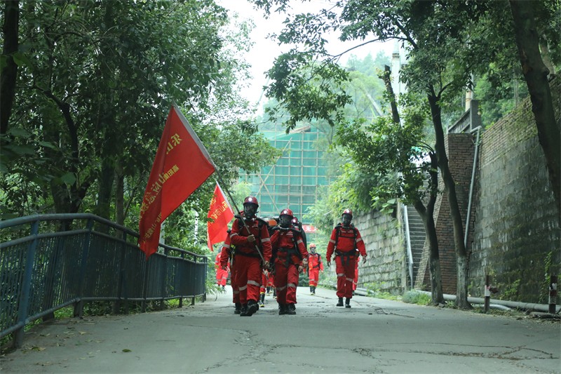 此次演練以復(fù)雜條件下的救援演練為主,全程佩帶重達(dá)13公斤的氧氣呼吸器,著重在于培養(yǎng)救援隊(duì)員的耐氧度和高濕條件下的佩機(jī)忍耐力。戰(zhàn)前分工、受領(lǐng)任務(wù)、集合隊(duì)伍、整裝待發(fā),上午9點(diǎn)30分,萬(wàn)米戴機(jī)行走在指揮員響亮的口令中拉開(kāi)了演練的序幕,佩帶齊全裝備的隊(duì)員們向著目的地一路進(jìn)發(fā),一身國(guó)旗紅在礦區(qū)、在山間路上格外引人注目?;Q氧氣瓶、傷員急救包扎轉(zhuǎn)運(yùn)模擬、安設(shè)高泡滅火機(jī)滅火、高溫濃煙,各小隊(duì)按照任務(wù)分工迅速到達(dá)指定地點(diǎn)有序展開(kāi)工作。在兩個(gè)多小時(shí)的訓(xùn)練中,隊(duì)員們團(tuán)結(jié)協(xié)作、密切配合,圓滿(mǎn)完成了指定任務(wù)。通過(guò)聯(lián)合演練,檢驗(yàn)了隊(duì)員們的身體素質(zhì)、技戰(zhàn)術(shù)水平、應(yīng)急反應(yīng)能力和團(tuán)結(jié)協(xié)作能力,確保隊(duì)伍戰(zhàn)時(shí)拉得出、沖得上、打得贏。