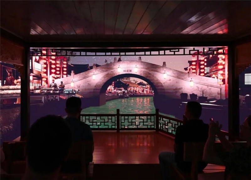 “船在水中行,人在畫中游,琳瑯滿目的夜景、波光粼粼的河水和挑擔(dān)叫賣的商販在觀眾眼前環(huán)形屏幕上依次呈現(xiàn),勾勒出一幅唐代成都夜游美景?!睋?jù)悉,作為此次調(diào)研重點(diǎn)的“七重空間,共生世界”虛擬現(xiàn)實(shí)主題館,于9月7日在四川省人民政府、工業(yè)和信息化部主辦的2023世界顯示產(chǎn)業(yè)大會亮相展示。