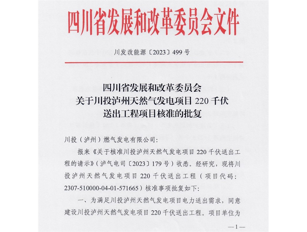 10月7日,川投瀘州天然氣發(fā)電項目220千伏送出工程項目取得四川省發(fā)展和改革委員會的核準批復(fù),正式進入國家行政許可建設(shè)流程。