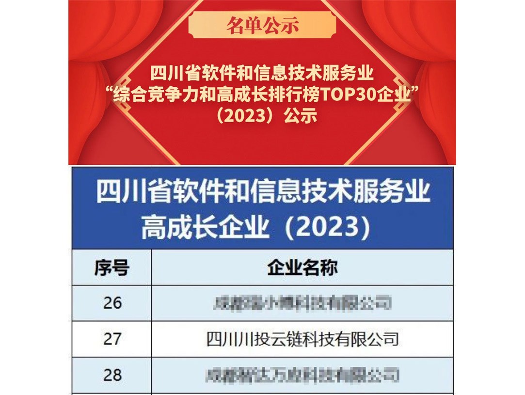 近日,四川省軟件行業(yè)協(xié)會完成了四川省軟件和信息技術(shù)服務(wù)業(yè)“綜合競爭力和高成長排行榜TOP30企業(yè)”(2023)公示,川投信產(chǎn)所屬川投云鏈憑借在科技創(chuàng)收能力、研發(fā)投入強度、產(chǎn)品競爭力等方面的突出表現(xiàn)入選高成長企業(yè)TOP30榜單。