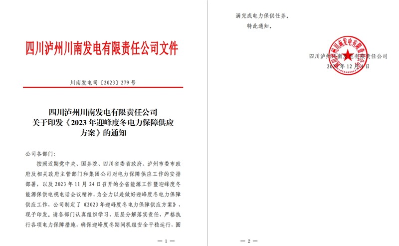 2023年入冬以來,四川電力供需處于緊平衡狀態(tài),全川燃煤發(fā)電機(jī)組能開盡開、應(yīng)發(fā)盡發(fā),其“兜底頂峰”保供頂梁柱作用進(jìn)一步凸顯。公司堅(jiān)決貫徹落實(shí)省委省政府、省國資委決策部署和瀘州市委市政府、川投集團(tuán)各項(xiàng)工作安排,把電力保供作為當(dāng)前最重要的政治任務(wù),全面推進(jìn)迎峰度冬保電各項(xiàng)工作。