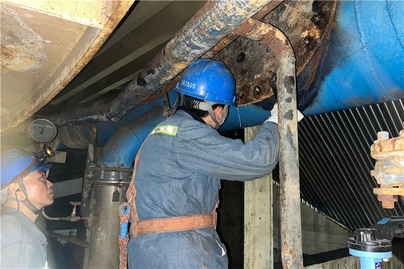 為解決這個問題,公司生產(chǎn)技術(shù)部牽頭制定了《關(guān)于機組運行期間脫硫一級塔氧化風母管檢查的安全技術(shù)措施》,發(fā)電部、設(shè)備維修部專業(yè)人員現(xiàn)場指導,運行值班員和檢修人員密切配合,做好吸收塔漿液品質(zhì)惡化的相關(guān)應(yīng)急措施,辦理工作票及受限空間作業(yè)票,并安排專人現(xiàn)場配合。經(jīng)過兩天的連續(xù)努力,順利完成了1、2號機組脫硫一級塔氧化風管的清垢工作。氧化風母管壓力在相同吸收塔液位和氧化風機入口門開度的情況下降低了2千帕,大大緩解了機組的運行壓力。