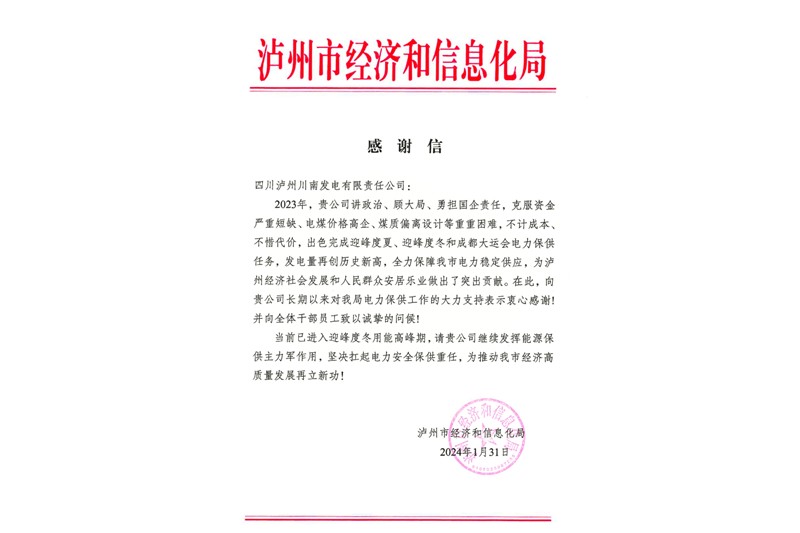 4月2月1日,公司收到瀘州市經(jīng)濟和信息化局發(fā)來的感謝信,對公司在2023年電力保供工作中的重要作用表示感謝,并向公司全體干部員工致以誠摯的問候!