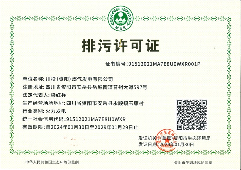 2024年1月30日,資陽燃?xì)怆娬拘陆üこ添?xiàng)目順利取得資陽市生態(tài)環(huán)境局頒發(fā)的排污許可證。