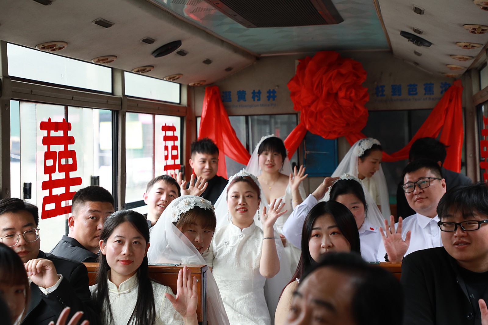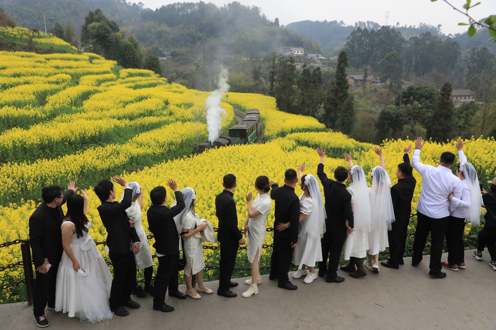 3月12日下午,來自川渝地區(qū)的多對新人盛裝抵達嘉陽小火車躍進站,攜手跨過象征著“歷久彌新”的鐵軌,登上寓意著“長長久久”的小火車車廂,在氣勢磅礴的汽笛聲中,向著旖旎秀美的幸福彼岸啟程。新婚燕爾的佳偶們,還在段家灣景點的金色花海前,回應小火車的鳴笛致意,讓這如畫的春景為美好姻緣做出見證。
