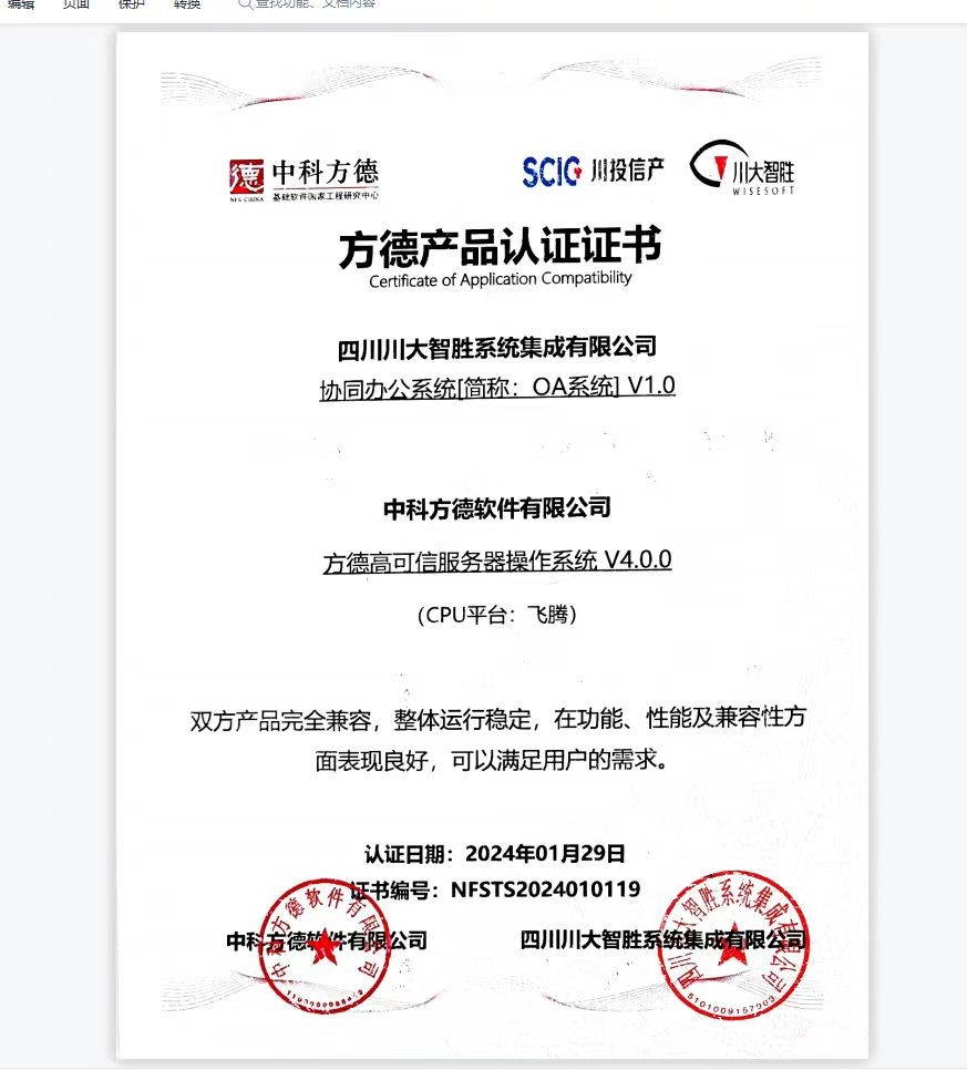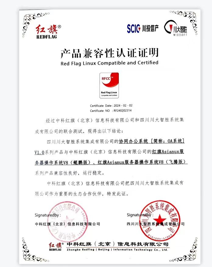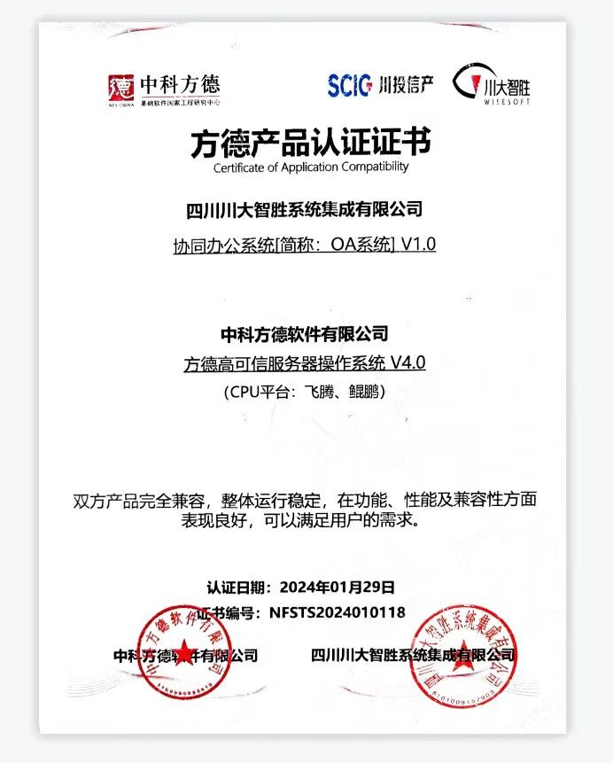 今年以來,為積極響應(yīng)市場需求,智勝集成以信創(chuàng)應(yīng)用軟件為突破口,開展了一系列技術(shù)創(chuàng)新和信創(chuàng)革新。在生態(tài)整合方面,公司攜手中科方德、中科紅旗等國內(nèi)主流信創(chuàng)平臺,進行了多層次的產(chǎn)品兼容測試認證工作。其中,公司協(xié)同辦公系統(tǒng) V1.0產(chǎn)品與中科方德的方德高可信服務(wù)器操作系統(tǒng) V4.0和方德高可信服務(wù)器操作系統(tǒng) V4.0.0產(chǎn)品進行了產(chǎn)品兼容性認證,獲兩項信創(chuàng)認證。