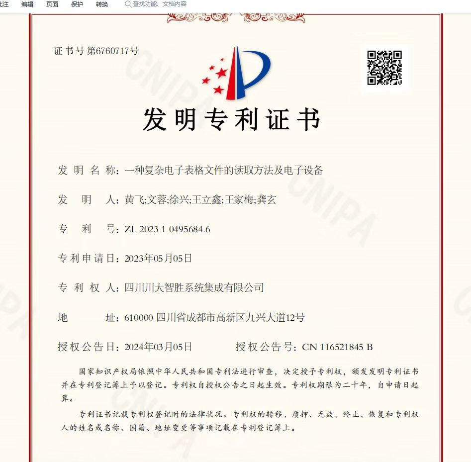 除了信創(chuàng)認證方面的突破,智勝集成在發(fā)明專利方面也取得了顯著進展。由公司申報的發(fā)明專利《一種針對復(fù)雜電子表格文件的高效讀取方法及相應(yīng)的電子設(shè)備》獲得授權(quán),該發(fā)明專利將助力企業(yè)優(yōu)化應(yīng)用軟件,有力提升企業(yè)在處理和導(dǎo)入電子表格數(shù)據(jù)時的性能與效率。