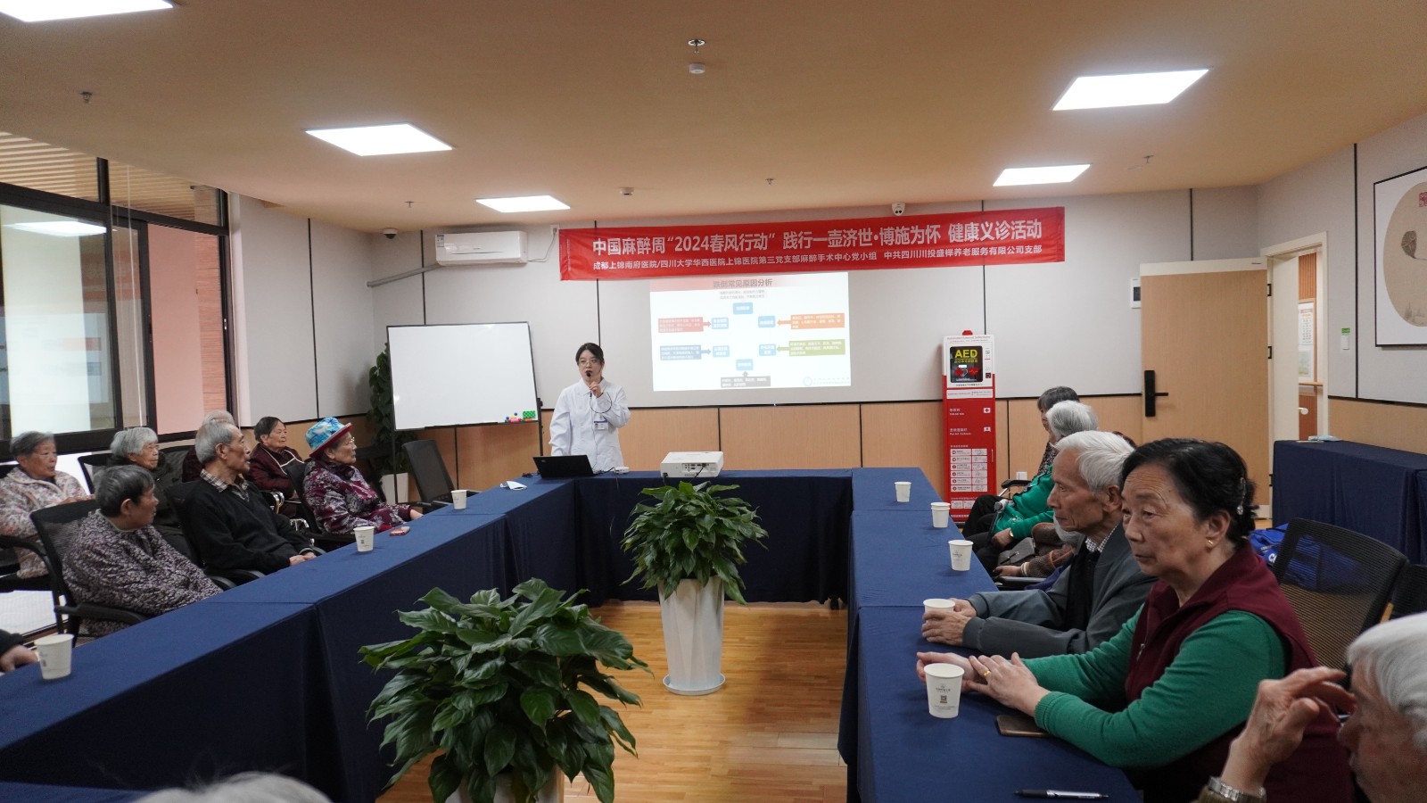 隨后,醫(yī)護(hù)人員們圍繞高血壓、骨質(zhì)疏松、跌倒風(fēng)險(xiǎn)等老年群體常見疾病進(jìn)行健康講座。講座中,各位長者積極分享自身防治經(jīng)驗(yàn),并與醫(yī)生護(hù)士們進(jìn)行溝通交流。一堂健康講座,不僅為長者帶來了醫(yī)生們專業(yè)的診療及防治建議,也加深了長者們健康養(yǎng)老的思想意識(shí)。講座中,醫(yī)護(hù)人員們還為機(jī)構(gòu)工作人員詳細(xì)講解了AED使用和心肺復(fù)蘇操作規(guī)范,提升了養(yǎng)老機(jī)構(gòu)突發(fā)應(yīng)急處置的專業(yè)性和規(guī)范性。