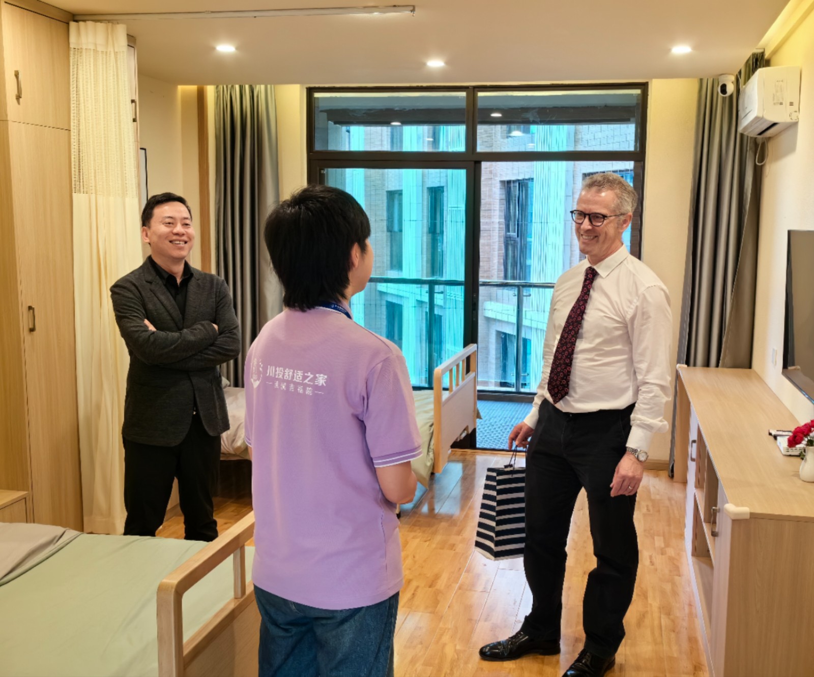 Ian Philip教授對川投盛櫸公司的熱忱接待表示感謝,他表示,川投舒適之家·武侯吉福院裝修設(shè)計(jì)別具特色、護(hù)理人員水平專業(yè)、長者生活幸福愉悅。希望雙方進(jìn)一步加深合作,通過優(yōu)勢互補(bǔ)、經(jīng)驗(yàn)互鑒、信息互通,激發(fā)養(yǎng)老照護(hù)模式本地化實(shí)踐的創(chuàng)新活力,共同成為建設(shè)引領(lǐng)積極、健康老齡化大潮的典范。