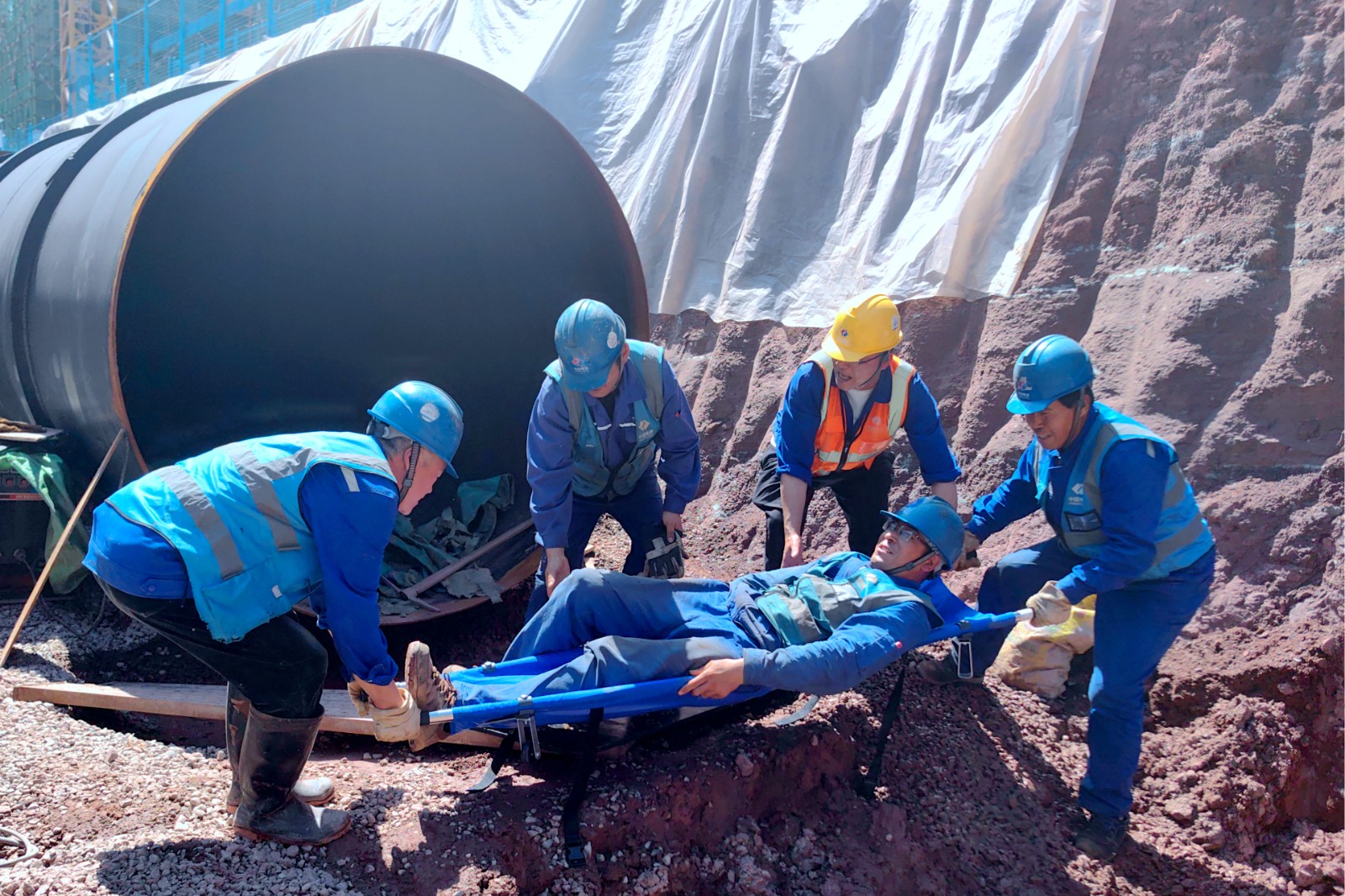本次演練分為醫(yī)療、救援、后勤、善后4個(gè)小組,采用實(shí)戰(zhàn)形式進(jìn)行演練。演練模擬場(chǎng)景為:5月13日下午,施工現(xiàn)場(chǎng)驟降暴雨造成循環(huán)水泵房北側(cè)的循環(huán)水管道基槽邊坡發(fā)生局部塌方,塌方導(dǎo)致基坑下方一名作業(yè)人員和工器具被掩埋,循環(huán)水泵房基坑內(nèi)流入大量積水,如不及時(shí)進(jìn)行抽排可能導(dǎo)致基坑邊坡浸泡發(fā)生大面積坍塌事故,需立即組織人員搶險(xiǎn)。接到險(xiǎn)情報(bào)警后,防汛應(yīng)急指揮部迅速啟動(dòng)應(yīng)急機(jī)制,第一時(shí)間組織應(yīng)急救援隊(duì)火速趕赴目標(biāo)地點(diǎn),按照防汛應(yīng)急方案,著眼實(shí)戰(zhàn),進(jìn)行了緊急救險(xiǎn)、轉(zhuǎn)移傷員、人員排查、積水抽排等應(yīng)急救援。