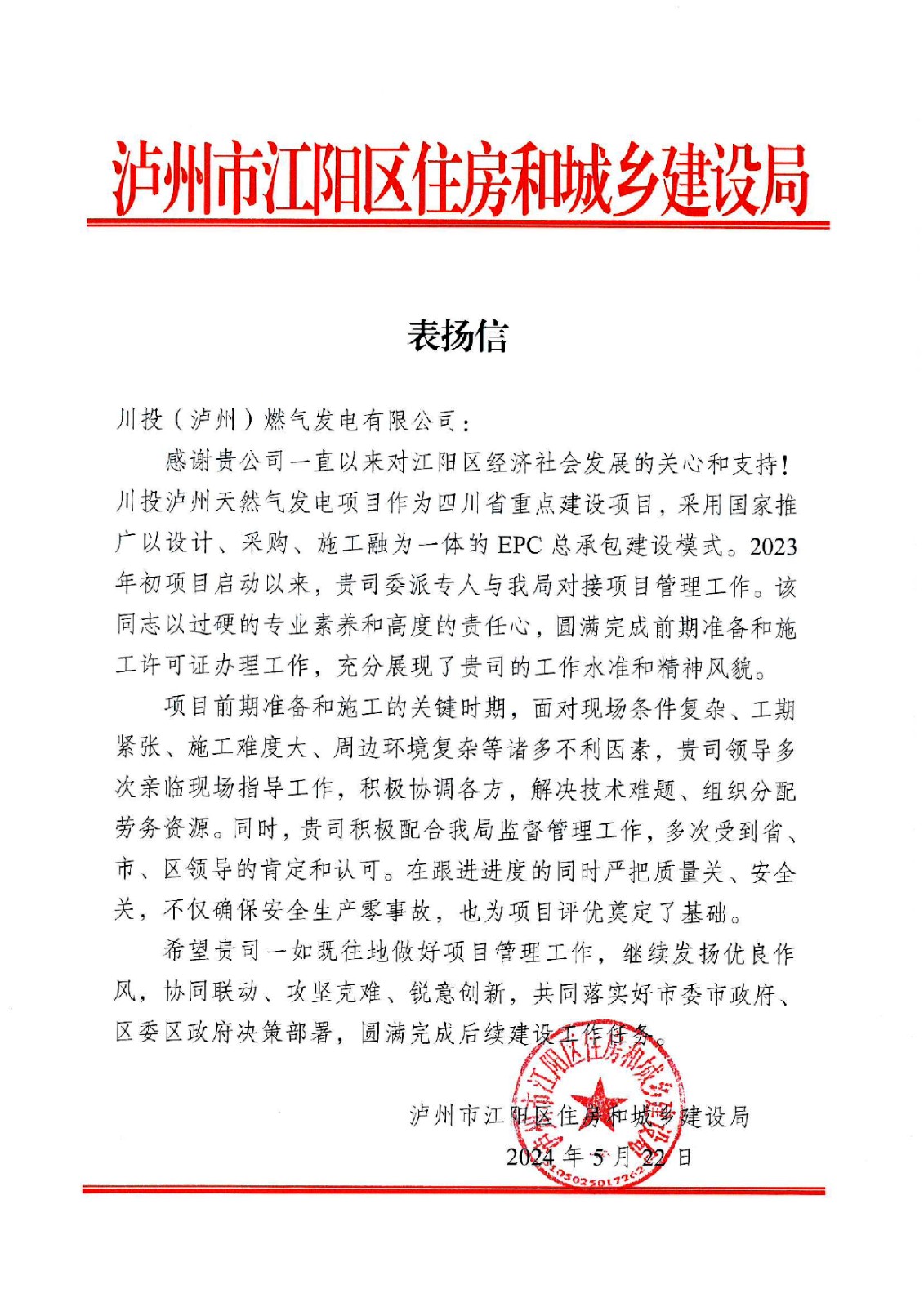 表揚信寫道:“瀘州氣電面對現(xiàn)場條件復(fù)雜、工期緊張、施工難度大、周邊環(huán)境復(fù)雜等諸多不利因素,積極協(xié)調(diào)各方,解決技術(shù)難題、組織分配勞務(wù)資源,同時,積極配合瀘州市江陽區(qū)住房和城鄉(xiāng)建設(shè)局監(jiān)督管理工作,多次受到省、市、區(qū)領(lǐng)導(dǎo)的肯定和認(rèn)可,在跟進(jìn)進(jìn)度的同時嚴(yán)把質(zhì)量關(guān)、安全關(guān),不僅確保安全生產(chǎn)零事故,也為項目評優(yōu)奠定了基礎(chǔ)”,高度贊揚了瀘州氣電優(yōu)良的工作作風(fēng)以及為瀘州市江陽區(qū)經(jīng)濟(jì)社會發(fā)展做出的辛勤努力和重要貢獻(xiàn)。