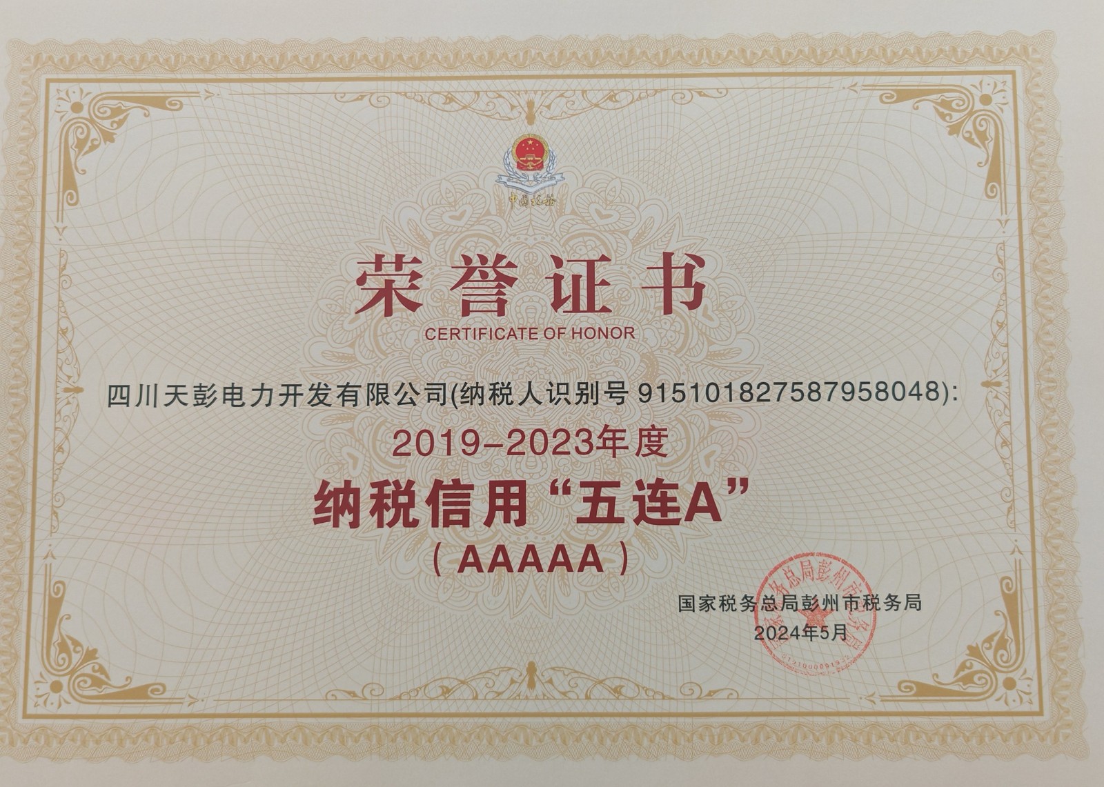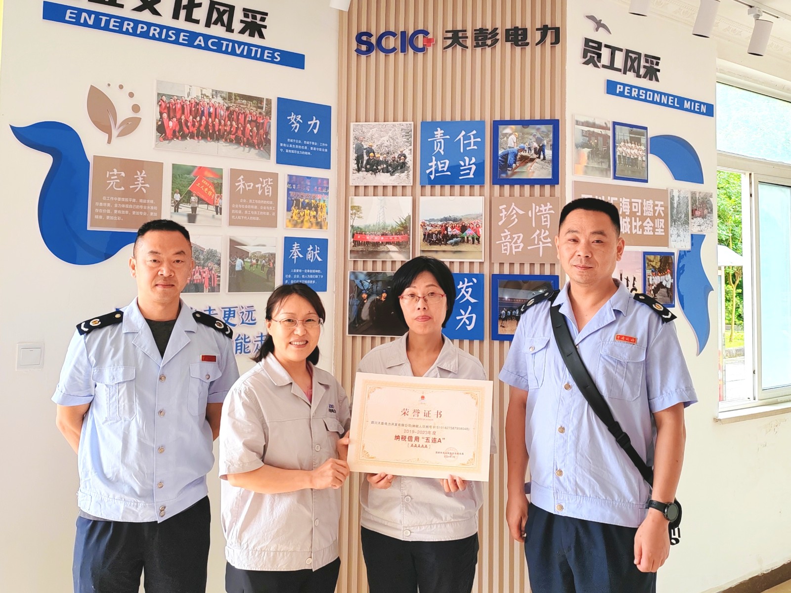 6月11日,川投能源所屬天彭電力公司喜獲殊榮:國家稅務(wù)總局彭州市稅務(wù)局向我公司授予了“彭州市‘2019-2023年度納稅信用五連A’”榮譽證書,這是稅務(wù)機關(guān)對我公司誠信納稅、守法經(jīng)營的肯定和表彰。