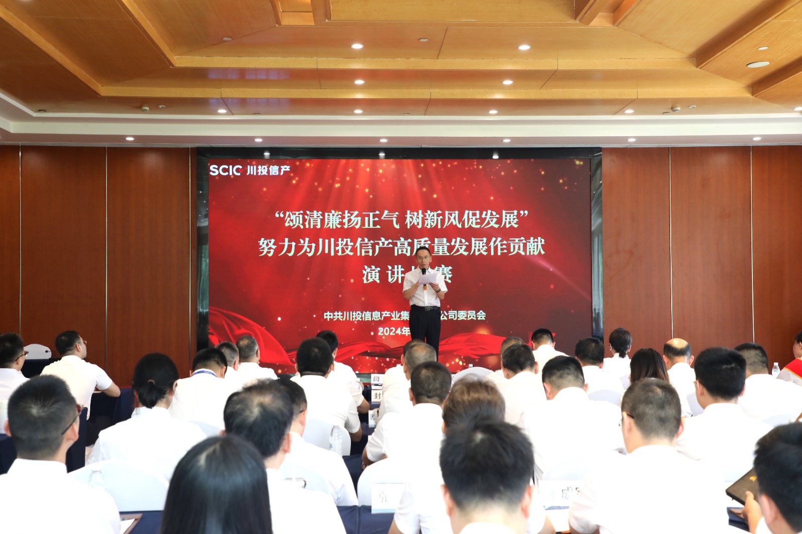 活動伊始,全體與會人員起立,奏唱國歌。隨后,演講比賽正式拉開帷幕,來自川投信產(chǎn)本部及所屬公司不同崗位的16組選手依次上臺演講,他們立足工作實際,結(jié)合自身經(jīng)歷,以生動的案例和深刻的感悟,從不同角度詮釋清廉與正氣的重要內(nèi)涵,用鏗鏘有力的語言和真摯飽滿的情感,暢談新時代青年的使命與擔(dān)當(dāng)。選手們的精彩表現(xiàn)深深打動著在場評委和觀眾,博得陣陣掌聲。