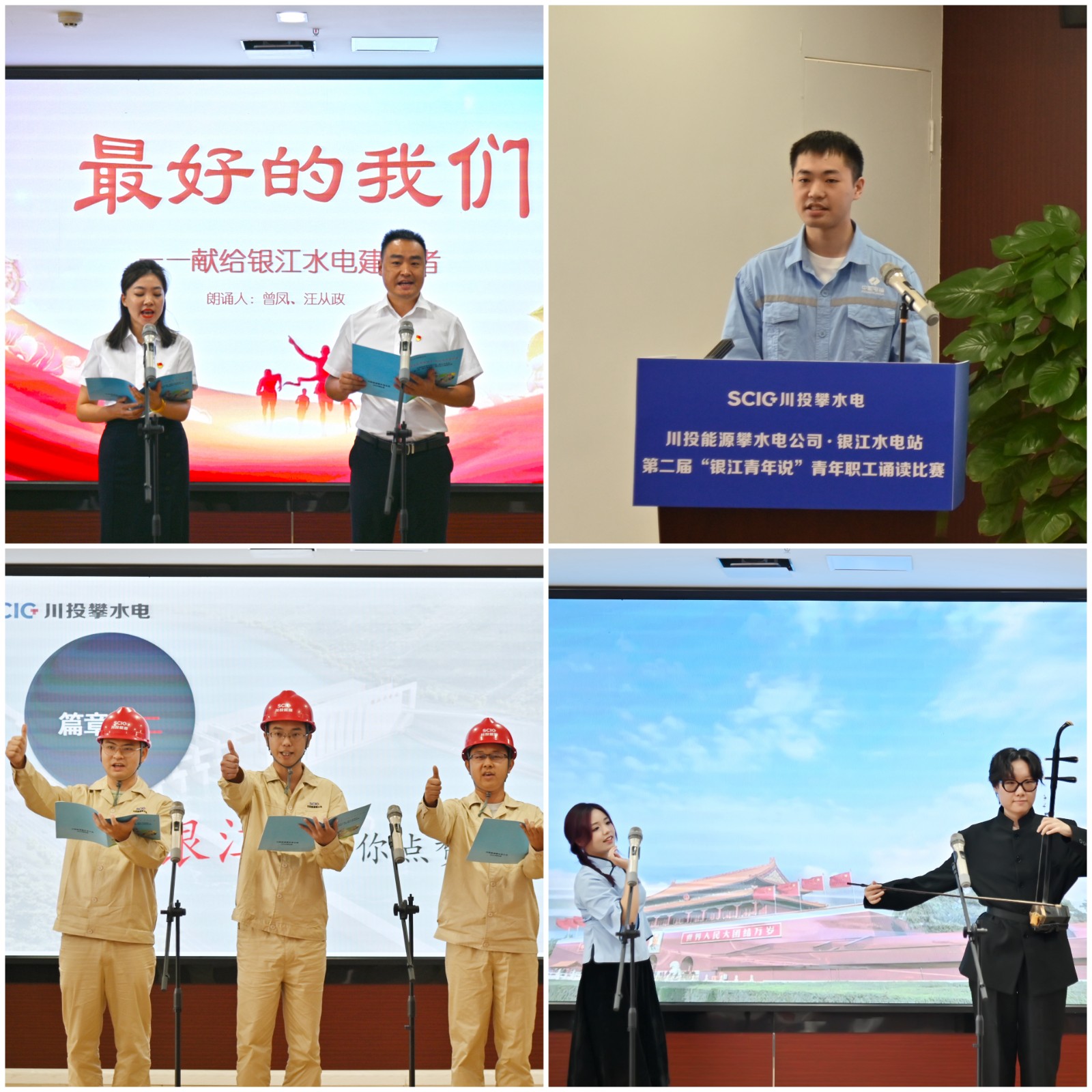 本次比賽以“蓄水發(fā)電加油干,銀江青年顯擔(dān)當(dāng)”為主題,來自公司及參建單位的10組14名選手結(jié)合各自的工作崗位精心創(chuàng)作了誦讀作品,他們中有剛退伍的發(fā)電部新兵,有剛畢業(yè)的財(cái)務(wù)新手,還有久經(jīng)沙場的一線職工,不同崗位、各色服飾、創(chuàng)意滿滿、精彩紛呈。來自水電五局項(xiàng)目部的黃山珊、扈文博身穿中國風(fēng)服裝,手拿傳統(tǒng)樂器二胡,以優(yōu)美的舞姿和深情的誦讀,回顧了歷史長河的中青年,贊美了日夜奮戰(zhàn)在施工一線的銀江青年,充分展現(xiàn)了當(dāng)代青年的文化自信,勇奪比賽第一名;平日里不善言辭、埋頭苦干的工程小伙也勇敢站上講臺,致敬了他們心中“年輕的戰(zhàn)場”,以一段充滿激情的歌聲瞬間把現(xiàn)場氣氛點(diǎn)燃;還有發(fā)電部新入職的小姑娘,外表文靜的她卻有著極強(qiáng)的爆發(fā)力,讓大家刮目相看。