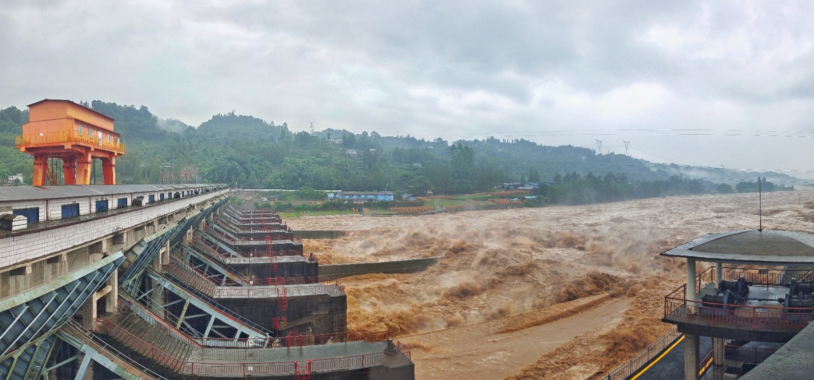 上游來水持續(xù)增大,7時(shí)10分,槽漁灘電廠的入庫流量達(dá)到9320 m3/s,電廠啟動(dòng)Ⅳ級(jí)應(yīng)急響應(yīng)。情況緊急,電廠職工一邊拉響警報(bào),提醒下游群眾及時(shí)撤離危險(xiǎn)區(qū),一邊組織現(xiàn)場(chǎng)巡查勸導(dǎo);檢修車間將1-9號(hào)泄洪閘門保持全開狀態(tài),值班員熊勇剛、陳利強(qiáng)迅速到崗到位,按操作程序安全提起9道閘門,并手動(dòng)將閘門高度從9.5米提升至10.5米。