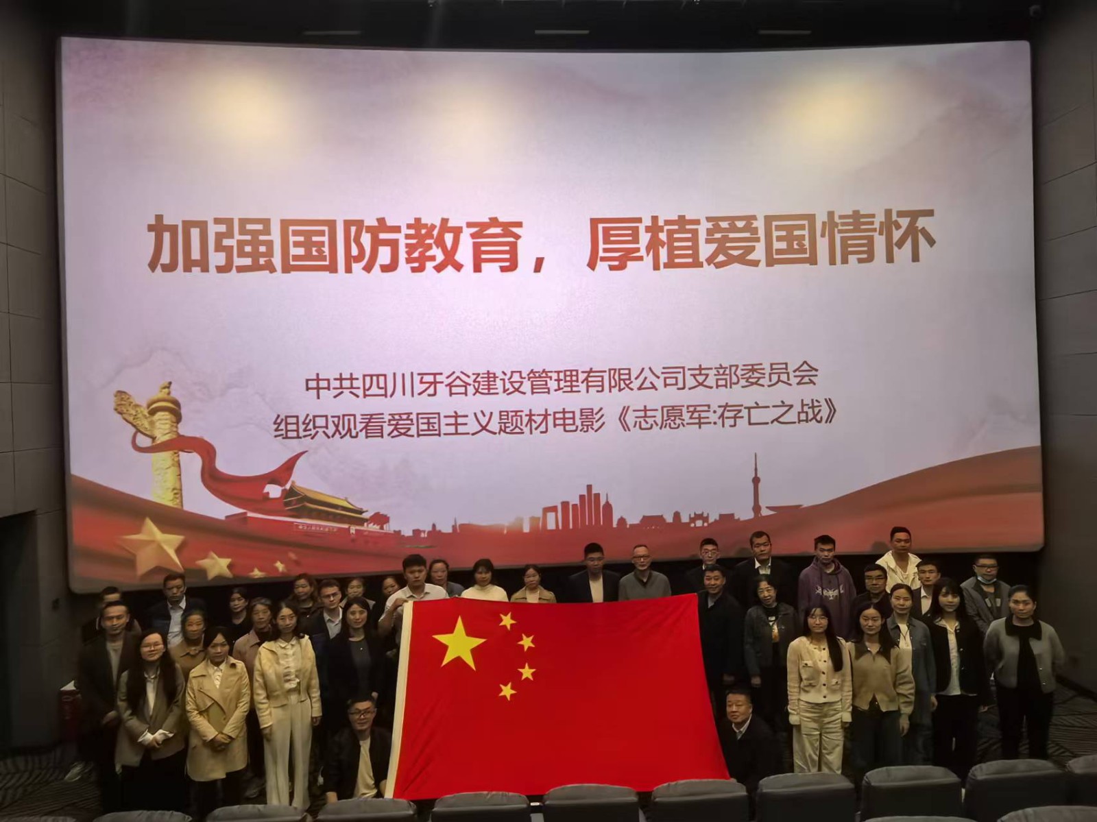 為堅(jiān)持以習(xí)近平新時(shí)代中國特色社會(huì)主義思想為指導(dǎo),深入學(xué)習(xí)貫徹習(xí)近平強(qiáng)軍思想和習(xí)近平總書記關(guān)于加強(qiáng)全民國防教育的重要指示精神,10月11日下午,牙谷公司黨支部組織公司全體員工、項(xiàng)目建設(shè)單位、物業(yè)管理公司、產(chǎn)業(yè)園區(qū)入駐企業(yè)黨員員工代表共計(jì)40余人開展國防教育主題黨日活動(dòng):觀看愛國主義影片《志愿軍:存亡之戰(zhàn)》。