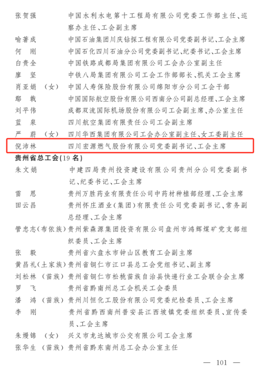 近日,中華全國總工會印發(fā)《關(guān)于表彰全國模范職工之家 全國模范職工小家 全國優(yōu)秀工會工作者的決定》。四川川投燃?xì)獍l(fā)電集團(tuán)有限責(zé)任公司(以下簡稱川投燃電)所屬四川宏源燃?xì)夤煞萦邢薰荆ㄒ韵潞喎Q宏源氣司)黨委副書記、職工董事、工會主席倪沛林獲評全國優(yōu)秀工會工作者。