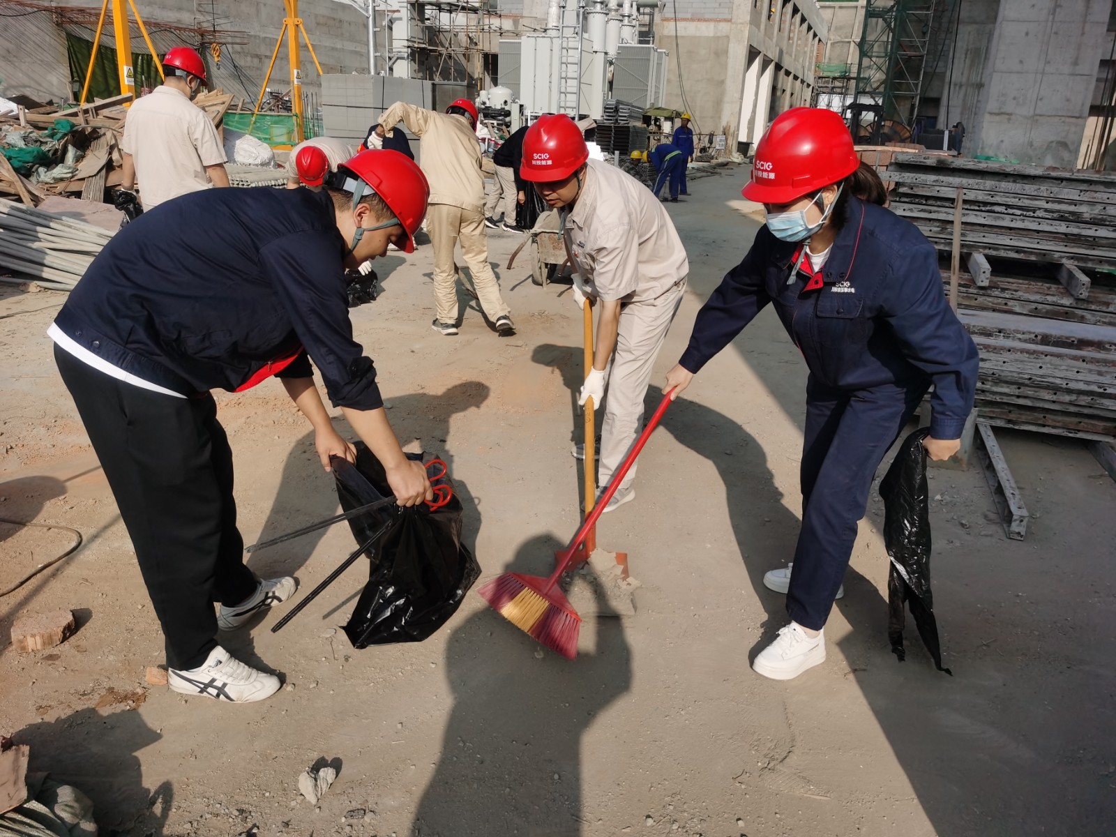活動(dòng)開始前,安全環(huán)保部經(jīng)理唐云宏從安全生產(chǎn)應(yīng)急知識(shí)、工地安全防護(hù)和注意事項(xiàng)方面進(jìn)行了簡要培訓(xùn),提醒、督促大家在施工現(xiàn)場一定要做到“抬頭看天,低頭看路”,認(rèn)真做好安全防護(hù),隨時(shí)保持安全警惕性。隨后,各支部黨員同志、志愿者們斗志昂揚(yáng)、團(tuán)結(jié)協(xié)作,分為三個(gè)小組開展工地清掃、整治衛(wèi)生死角活動(dòng),大家手持垃圾袋、掃帚、火鉗等工具,對(duì)壩頂、GIS樓、上游導(dǎo)流明渠、鋼筋場等區(qū)域進(jìn)行了集中清理整治,共同營造了干凈整潔的施工環(huán)境。